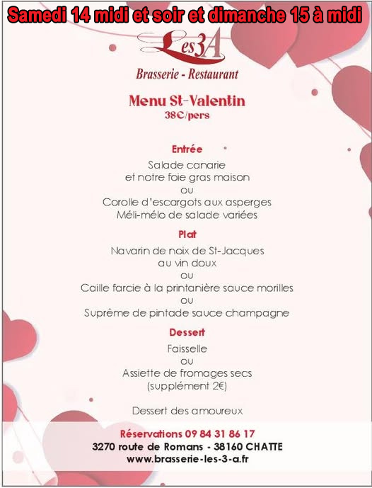 Réservez votre repas de la St Valentin Samedi 14/02 – Midi/Soir et dimanche Midi Brasserie Restaurant Traiteur Les 3A – 7/7 les midis